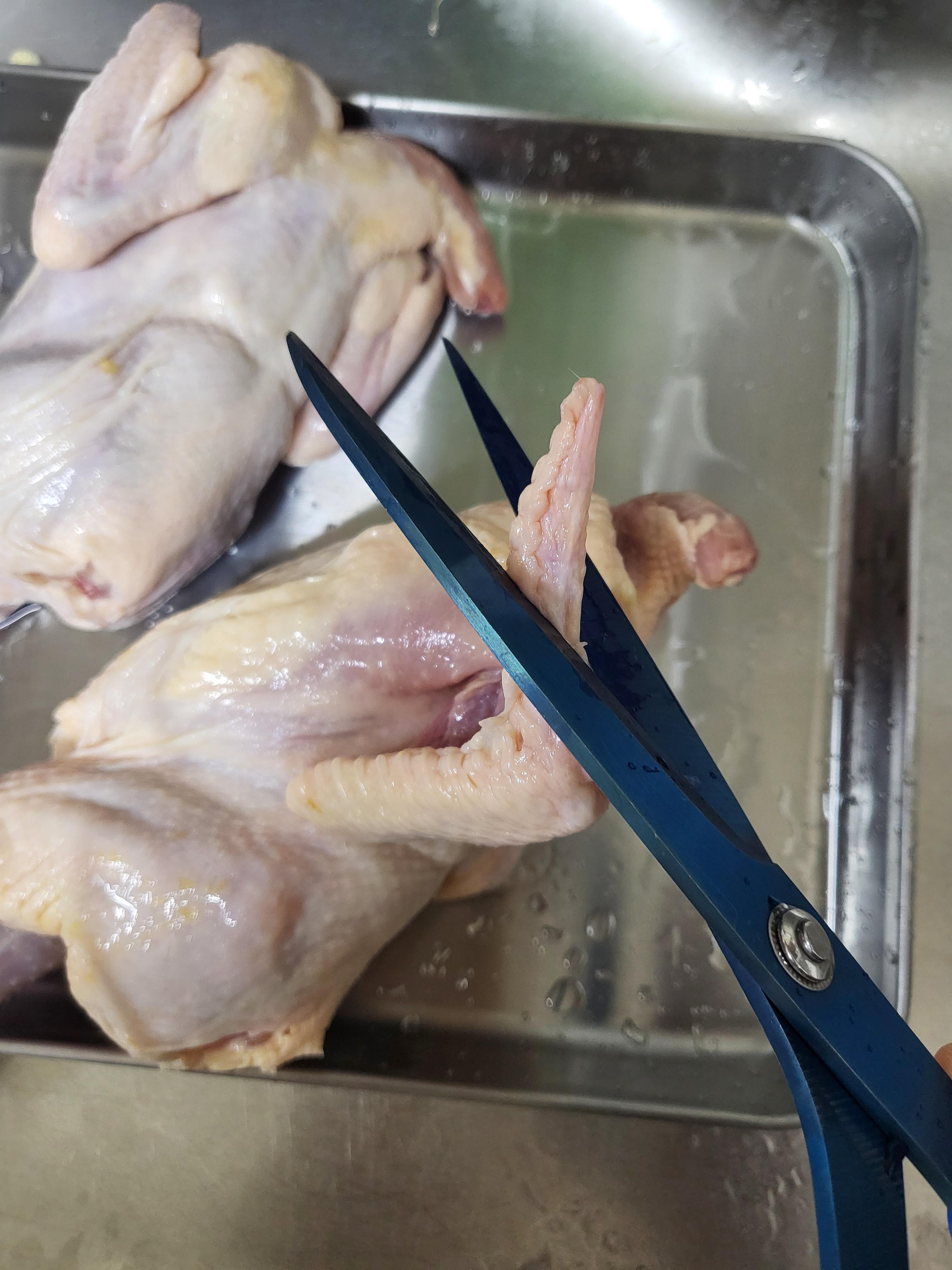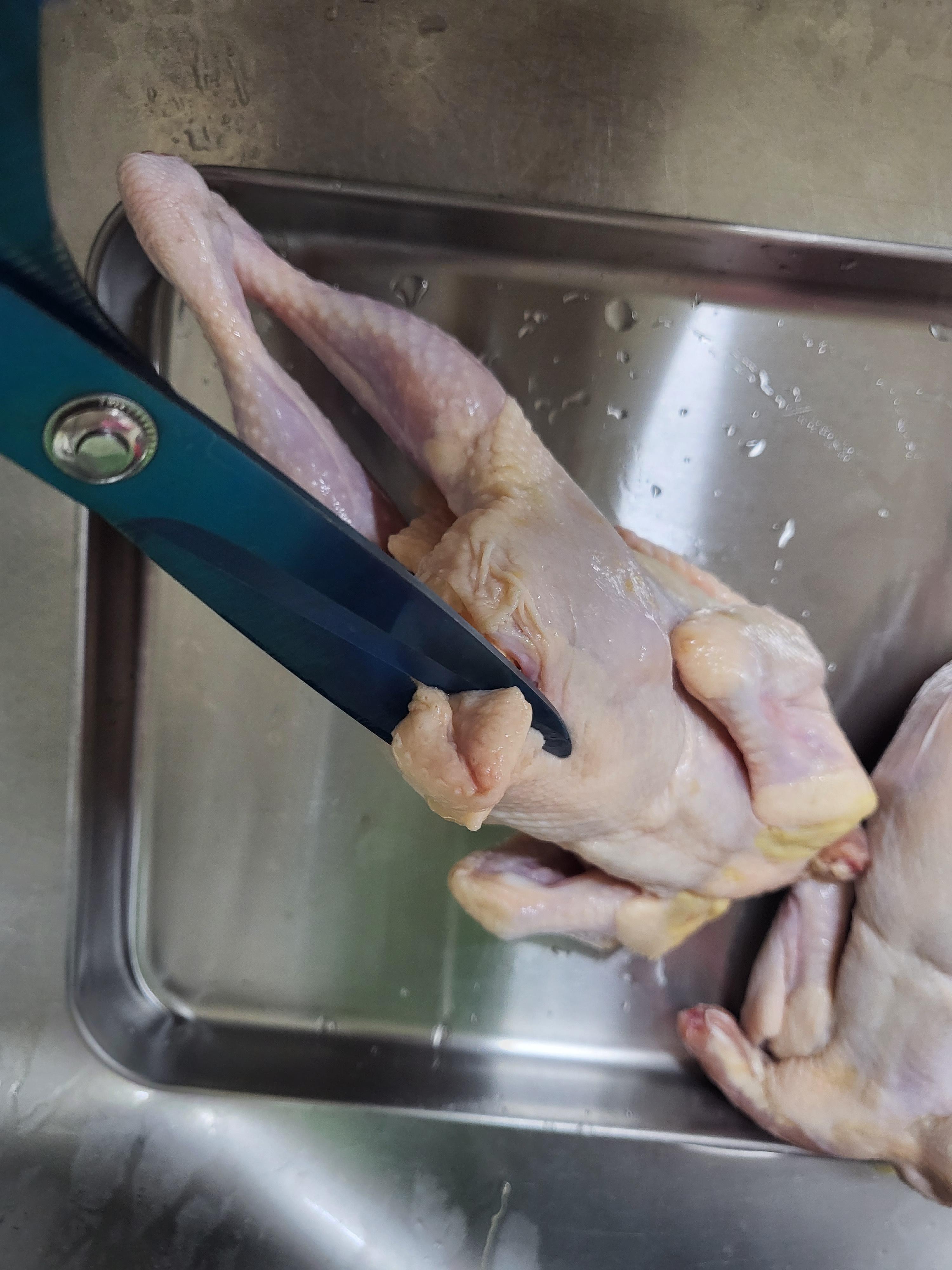 1. 닭을 깨끗이 손질 합니다. 냄새가 날 수있는 꼬랑지 부분과 날개 끝부분을 잘라내고 가슴 부분 쪽으로 반을 갈라 안에 붙어있는 불순물과 기름을 떼어냅니다.